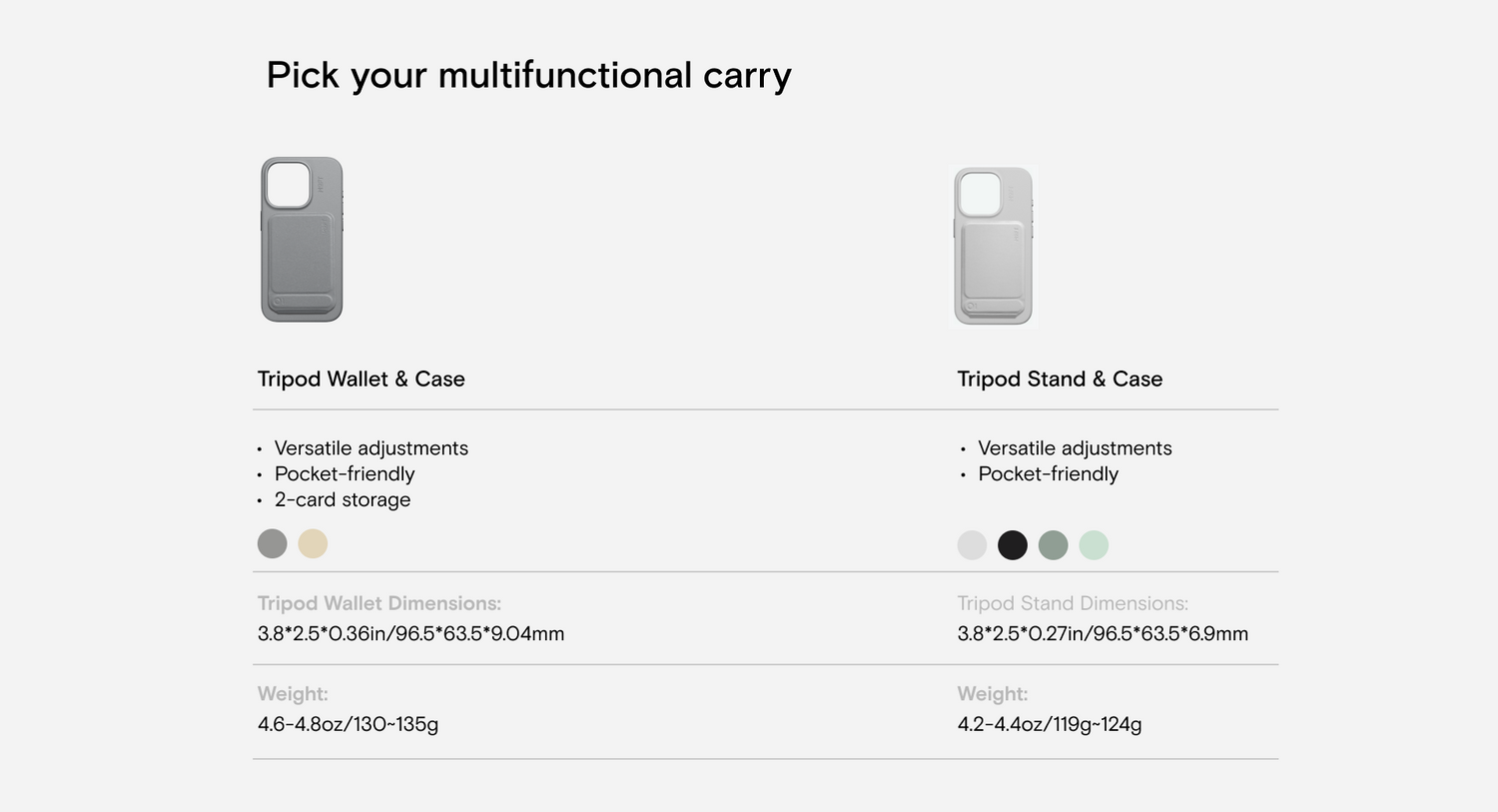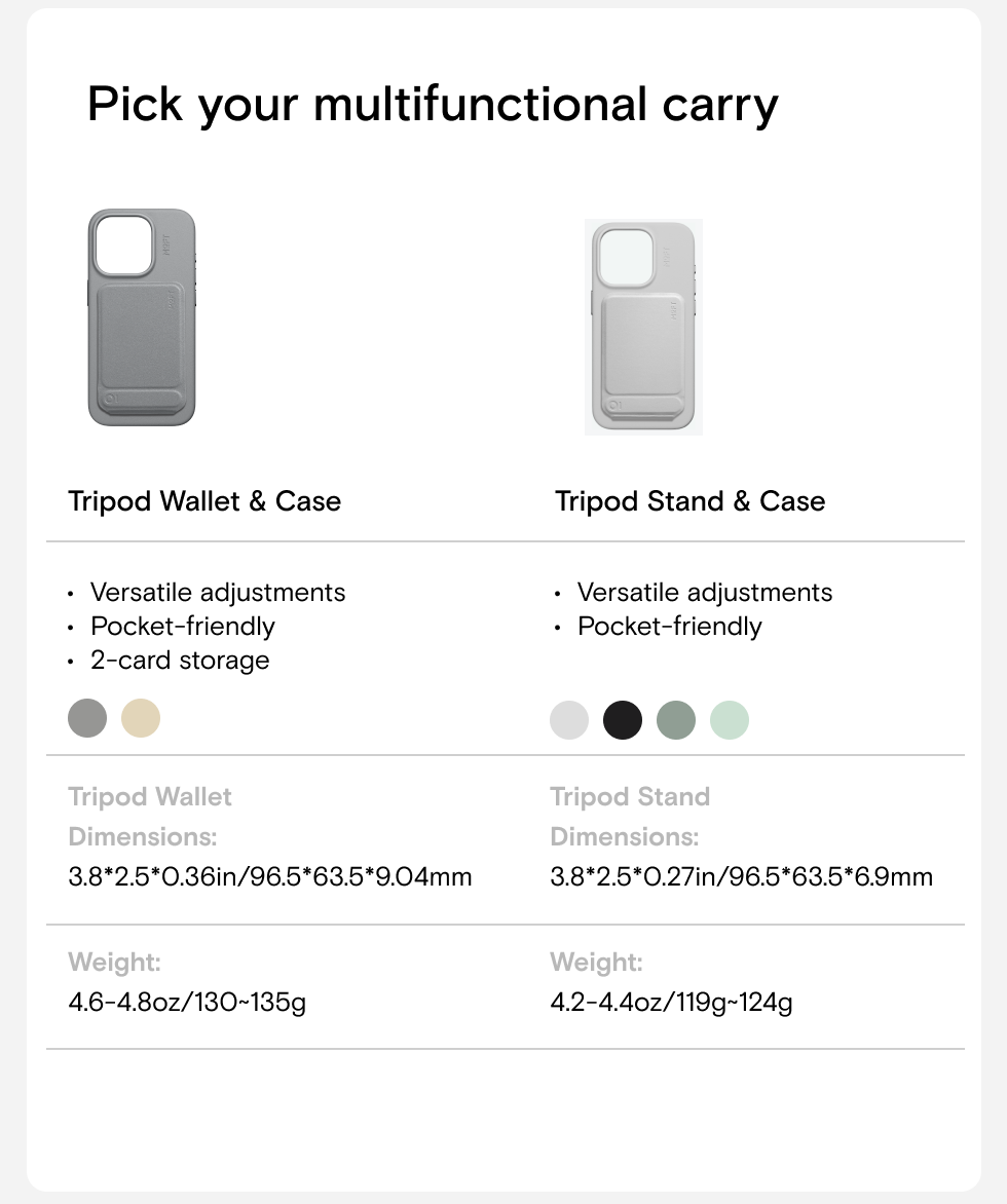 Tripod Stand - Jet Black, Tripod Stand - Misty Cove, Tripod Stand - Seafoam, Tripod Wallet - Taupe, Tripod Wallet - Earthen Beige, Tripod wallet - Sunrise |
