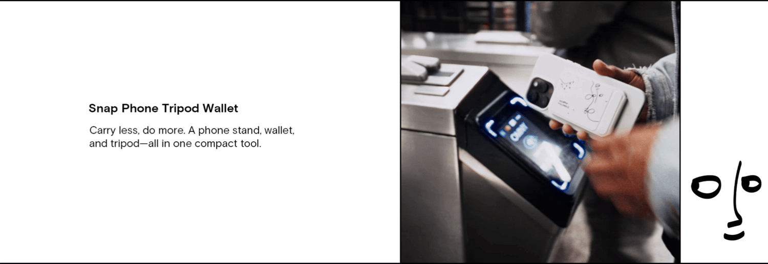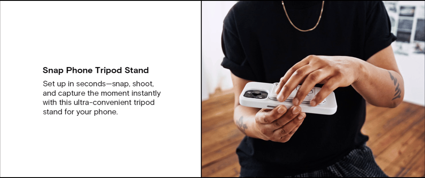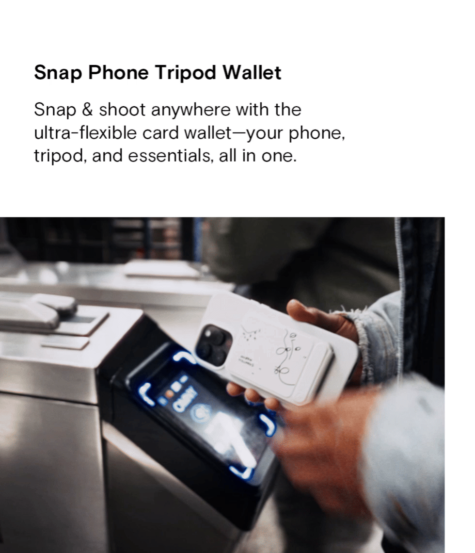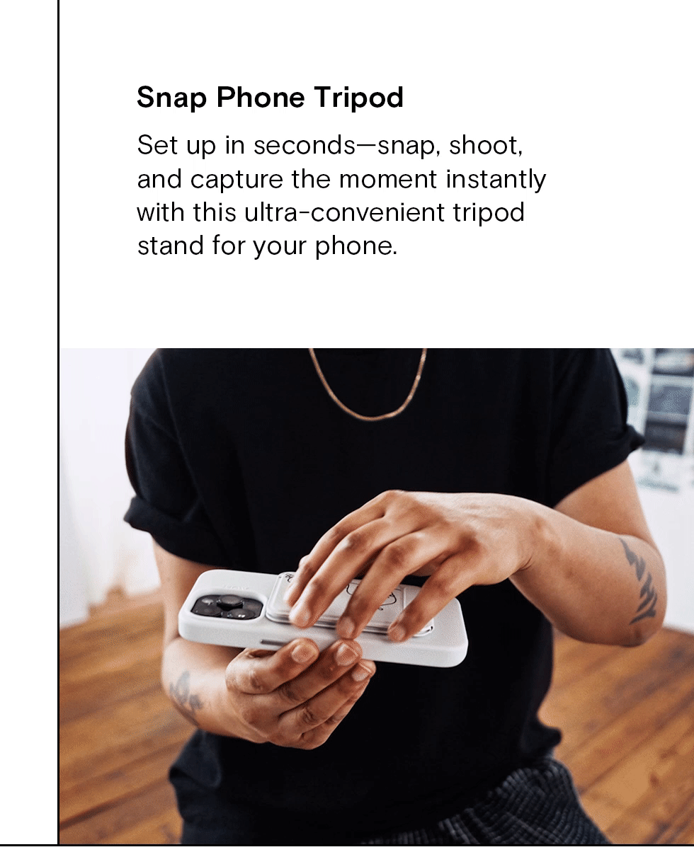 Snap off the Tripod Stand to switch to other accessories, snap back on the Tripod Stand and stack on an accessory like our Snap Stand & Wallet to carry together effortlessly (For the wallet stacks on the tripod, check out the last gif on the main image section).