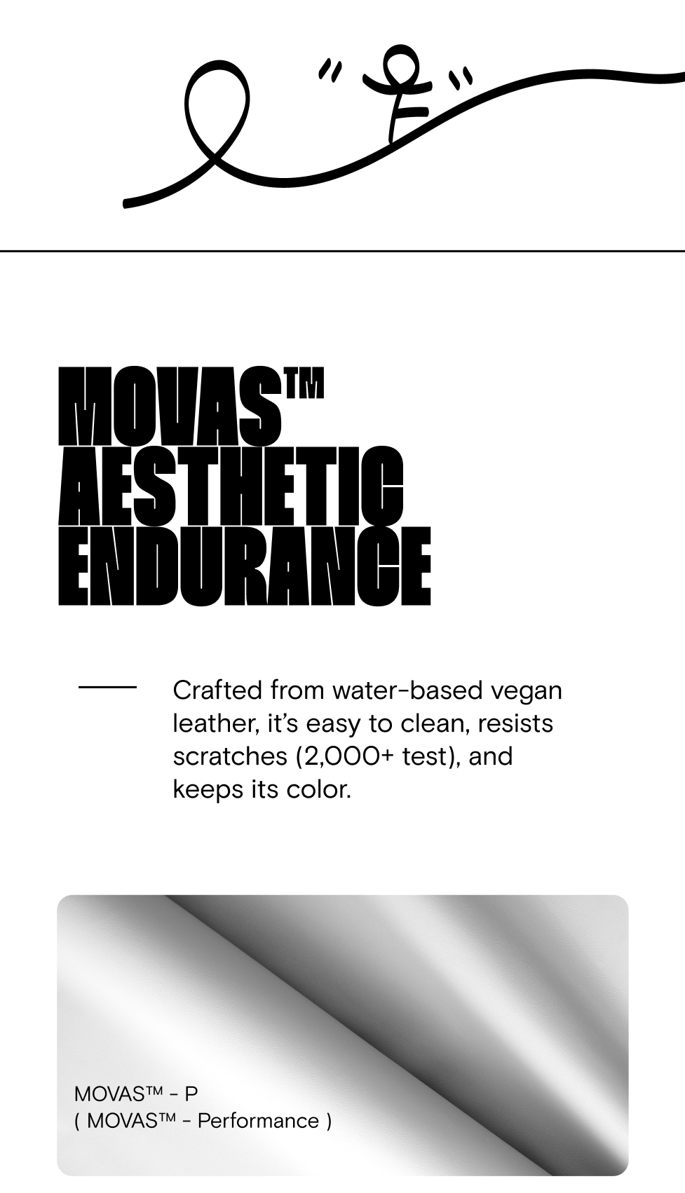 The MOVAS™-E vegan leather also retains its vibrant color for a long time through a unique dyeing process and materials. A quick tip: Avoid strong chemicals that might damage the leather and lead to color fading. To keep it looking sharp, use alcohol below 75% concentration and skip other chemical cleaners in your regular maintenance routine.