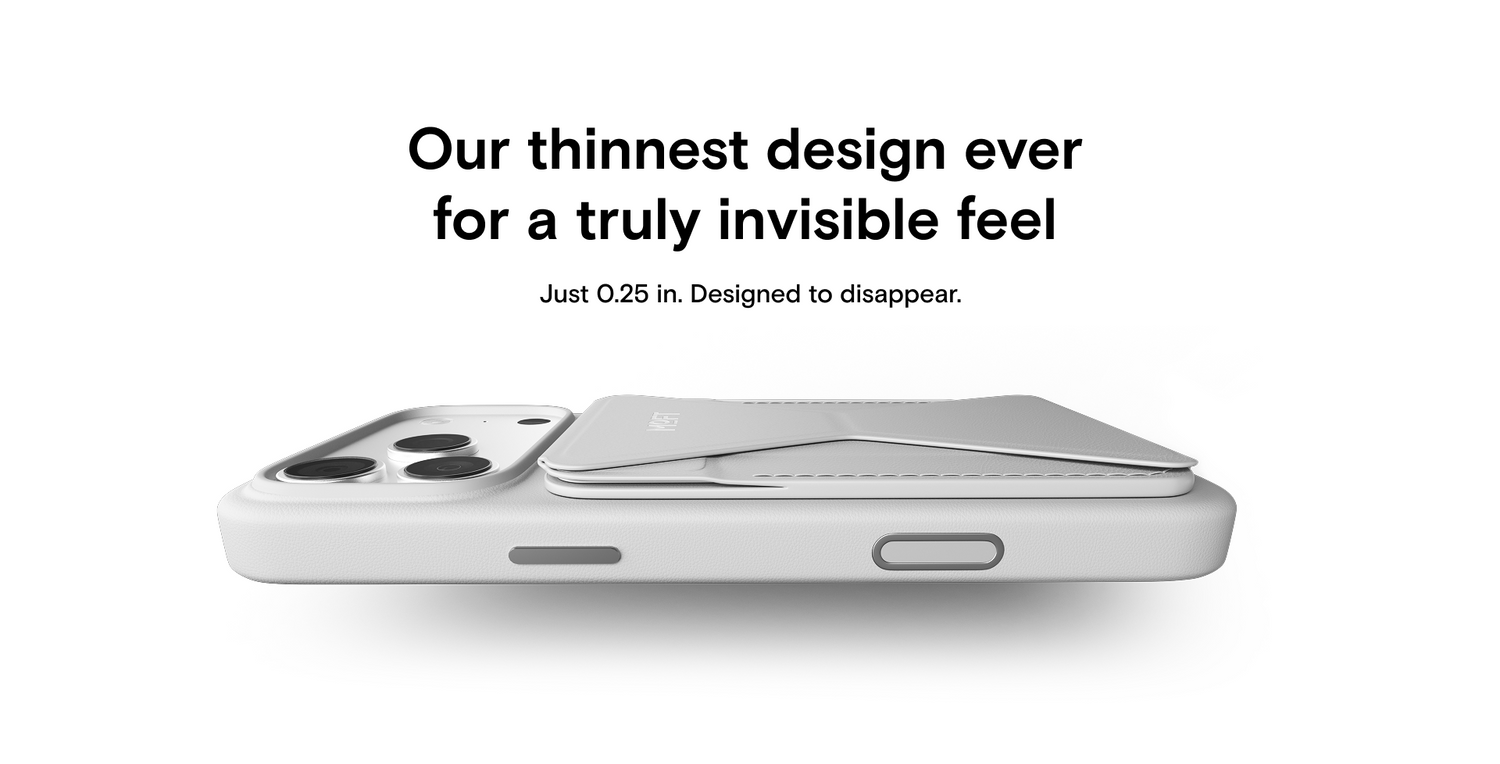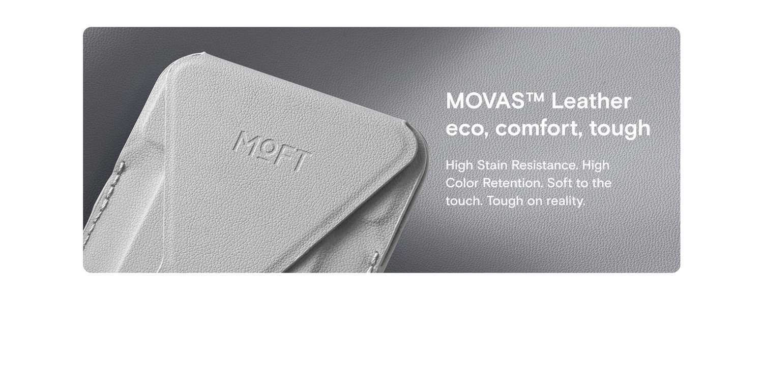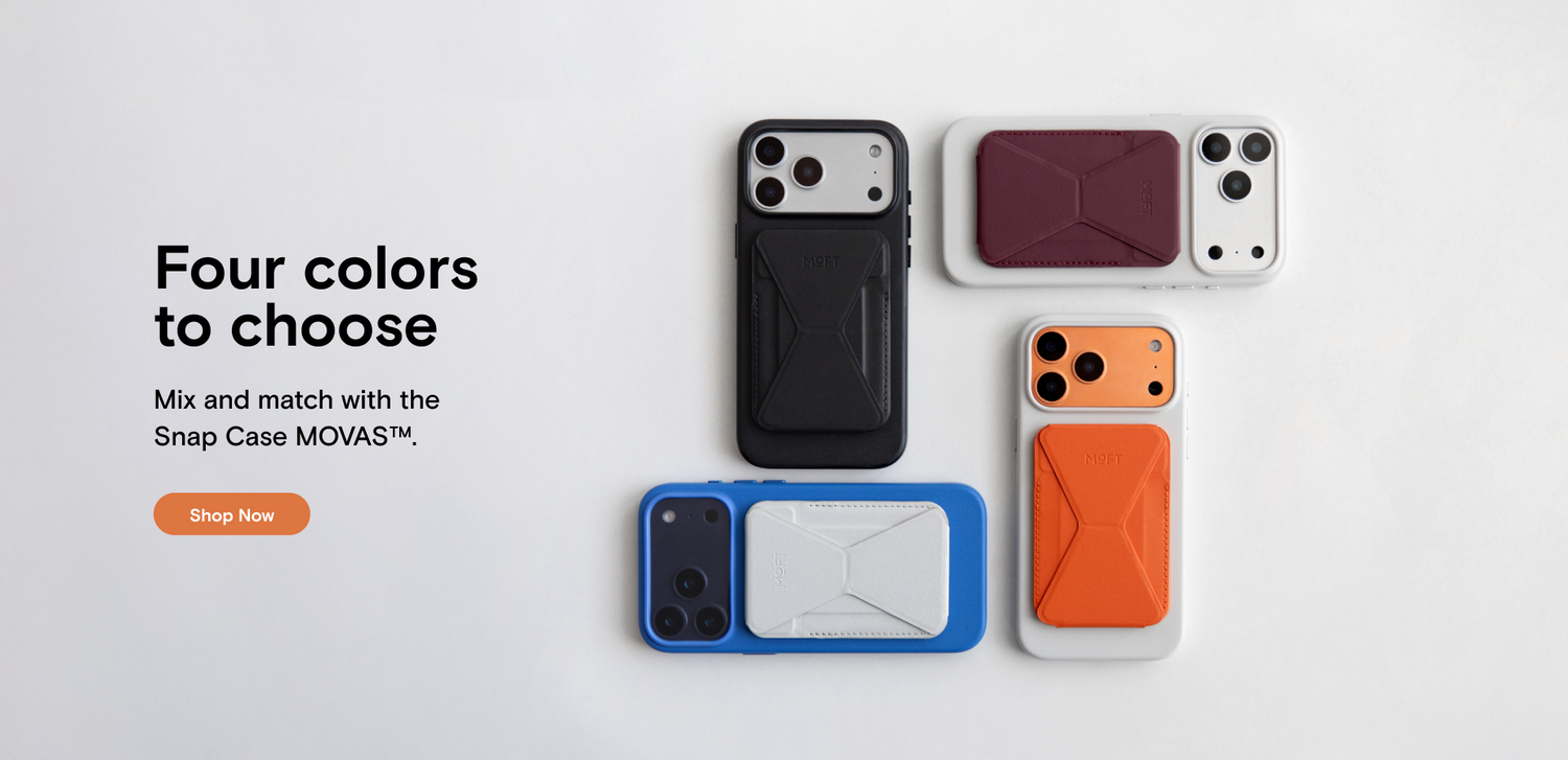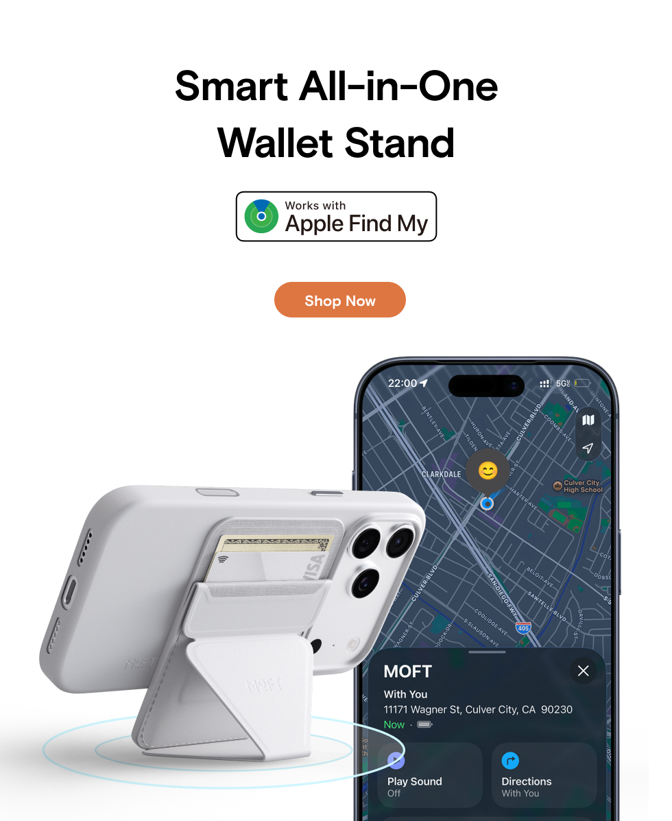 The Moft Trackable Snap-on Phone Stand & Wallet is a slim MagSafe wallet that can hold up to three cards. The back of it folds down to reveal the cards inside and acts as an impromptu stand.