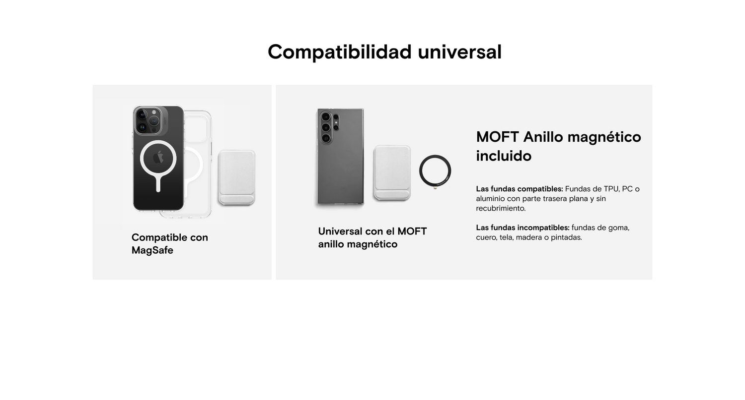 Universal para otros modelos de móvil, incluidos Android, iPhone sin MagSafe y fundas de silicona con un MOFT anillo metálico incluido.
