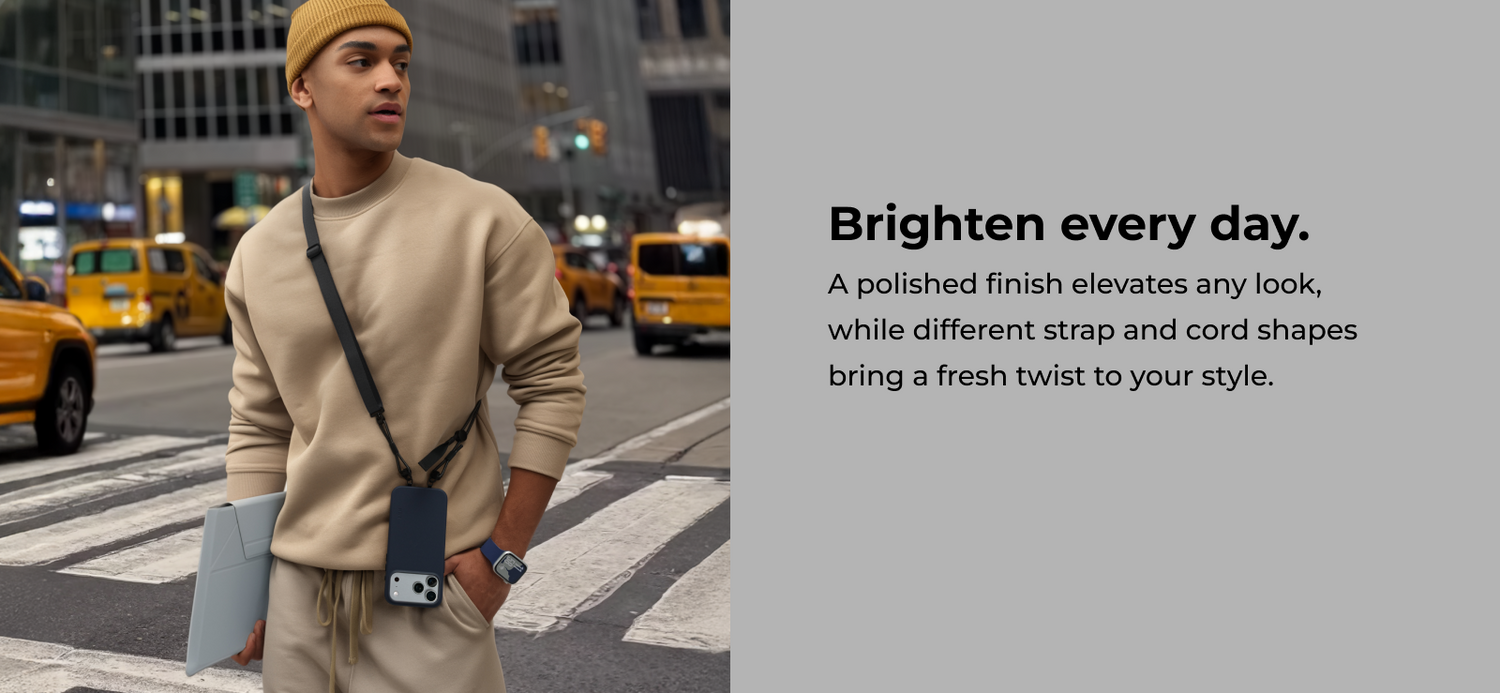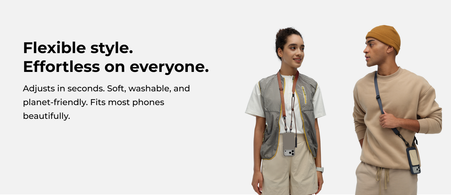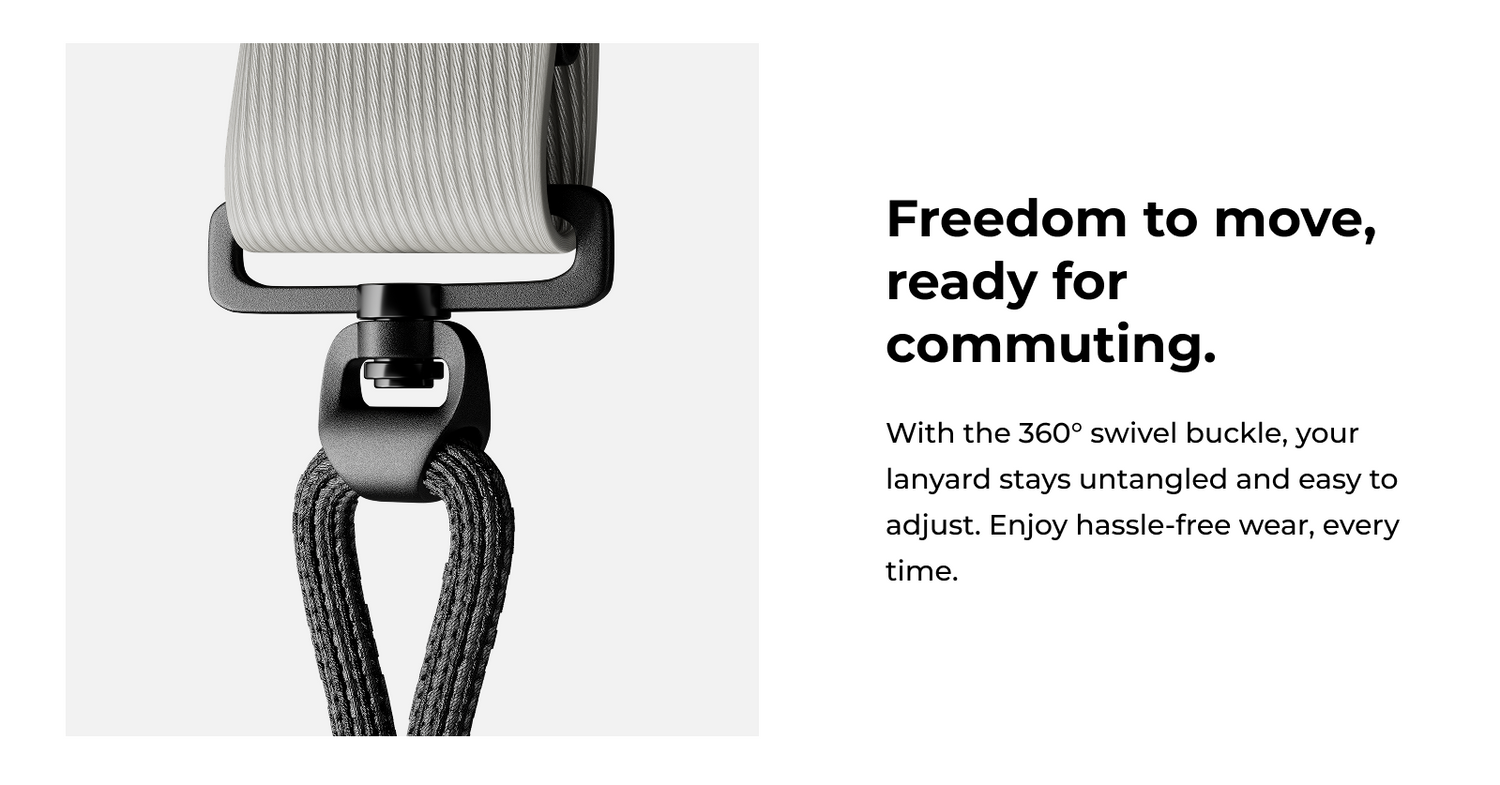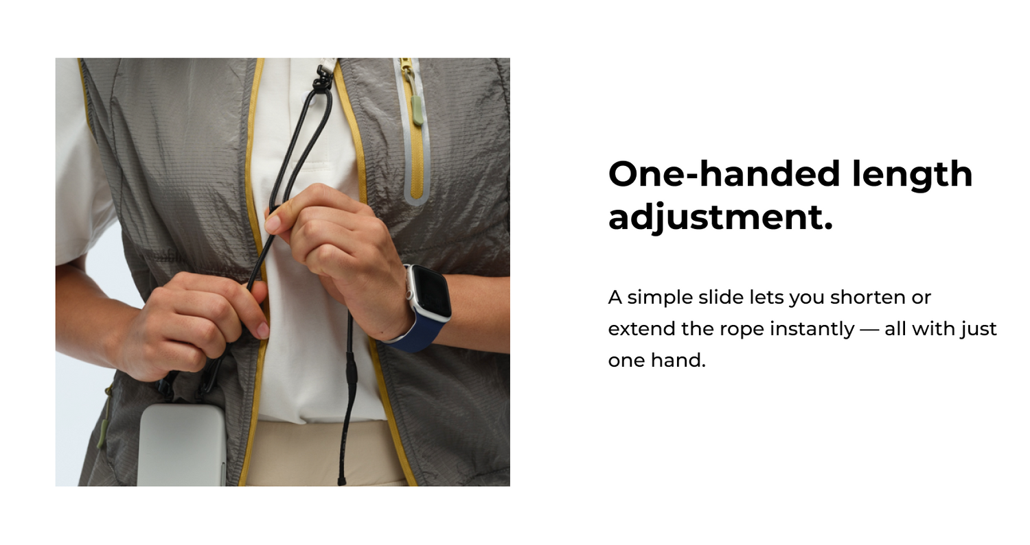 The length of Everywhere Lanyard is between 35~60in/89~154cm. For the first-time wear, it's recommended adjusting the length through the button on the flat lanyard which is adjustable between 20~38in/52~98cm, then you can wear it crossbody, around the neck or over the shoulder. In daily life, you can adjust its length through another control button with one hand for various usage scenarios.