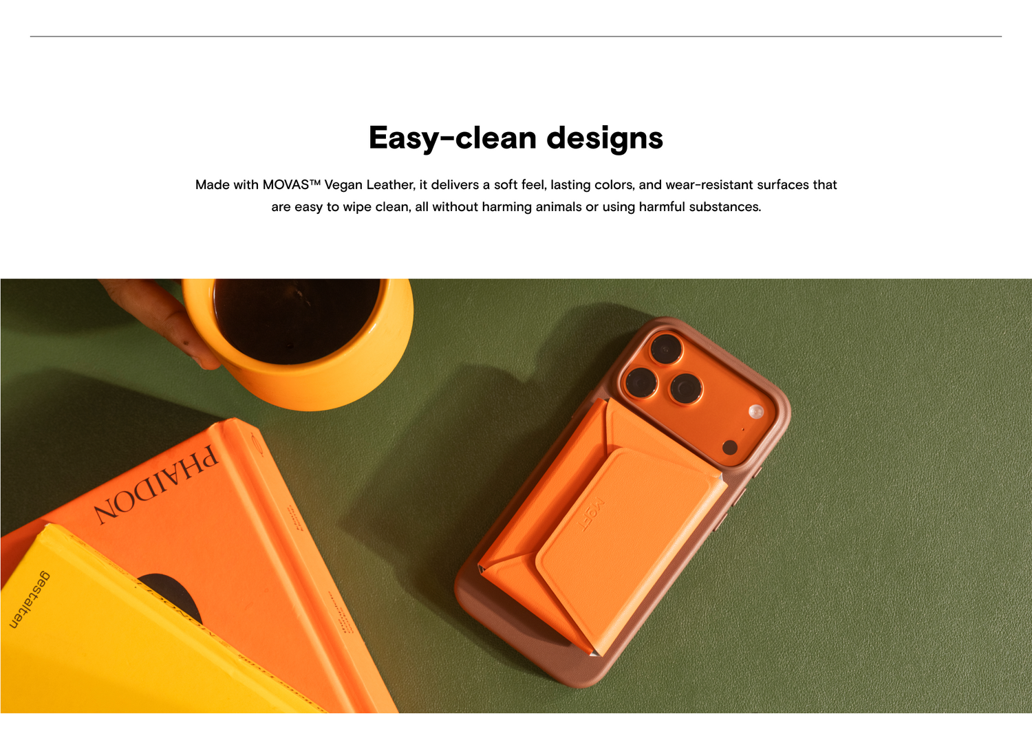 The Snap Field Wallet is made with scratch-resistant MOVAS material that has high color retention, so you can wipe the surface using a damp cloth and alcohol less than 75% to remove common residue in daily life.