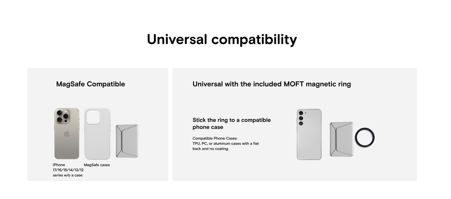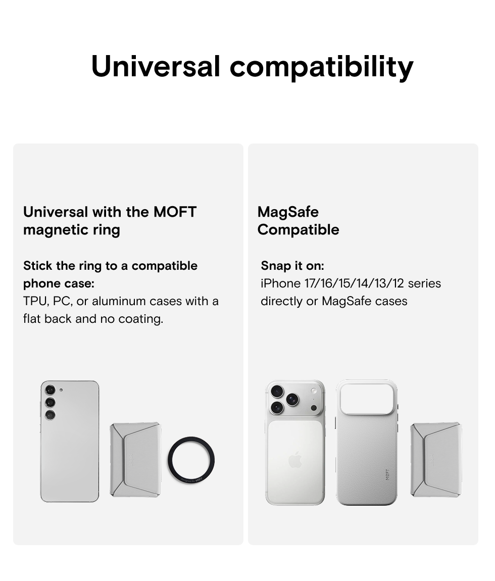 • non-MagSafe compatible phones with a phone case (a metal ring is included to be attached to the phone case)