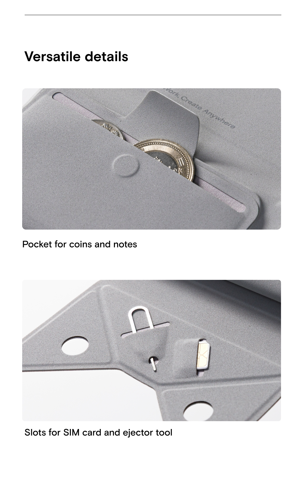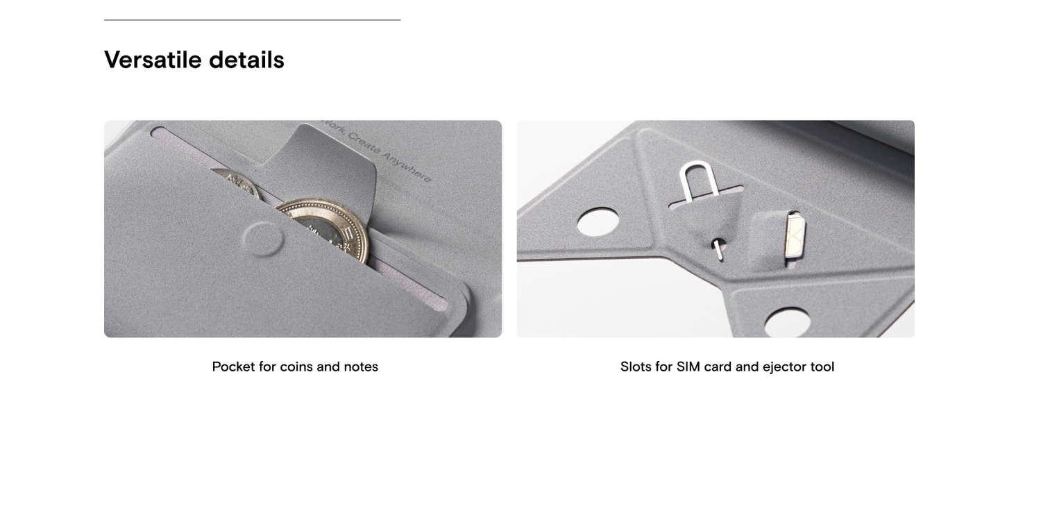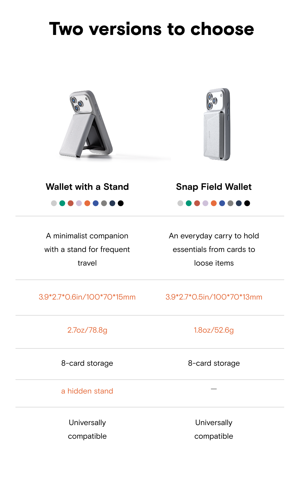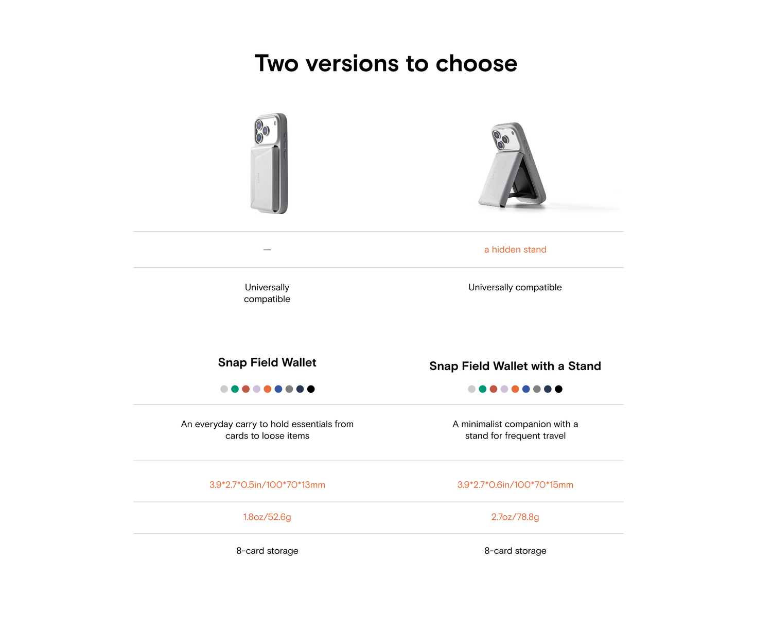 The difference is that one version has a hidden stand for minimalist travel. The standard version is 0.5in/13mm thick and weighs 1.8oz/52.6g, whereas the stand version is 0.6in/15mm and weighs 2.7oz/78.8g. Both versions have space for up to 8 cards.