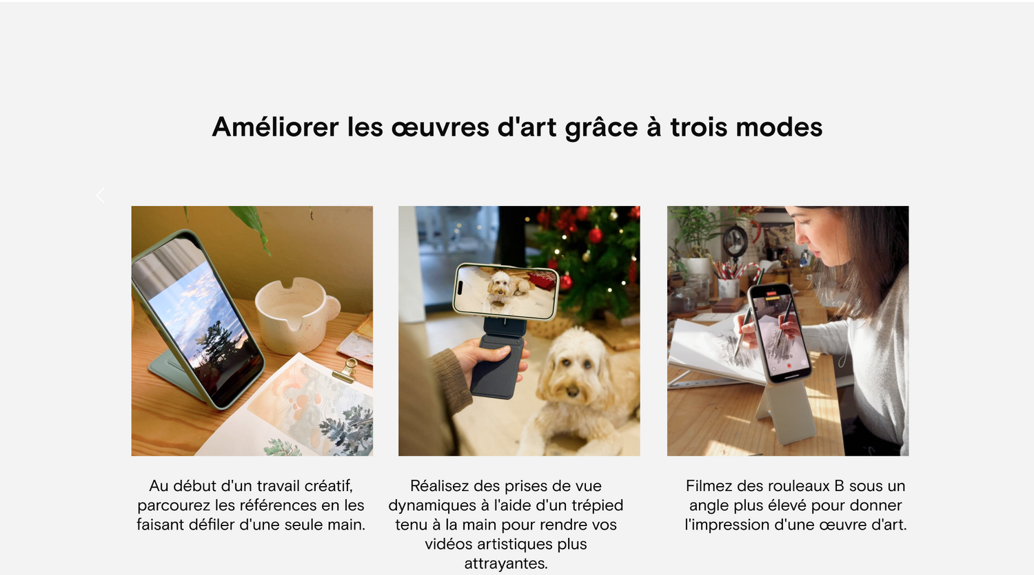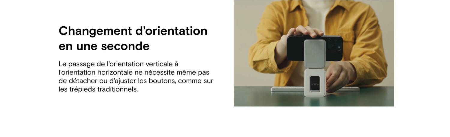 Certes, vous pouvez placer le bloc-batterie Snap directement entre le trépied et votre téléphone, comme un sandwich, grâce à la conception magnétique double face du bloc-batterie. Cependant, il est préférable d'éviter cette configuration lorsque vous utilisez l'angle d'appel vidéo, car elle peut faire basculer le téléphone en raison d'un déséquilibre de force.