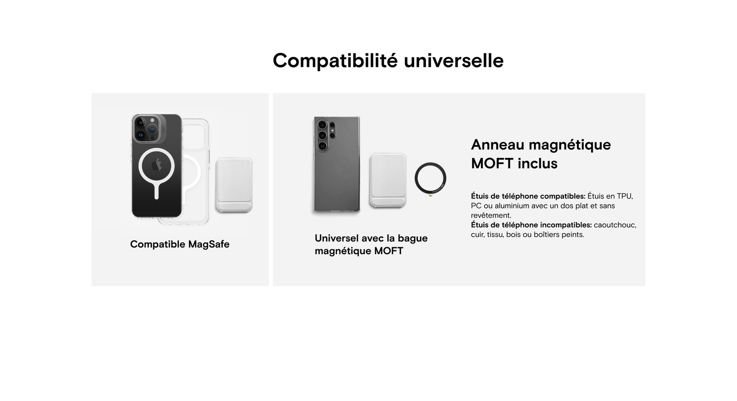 iPhone 12/13/14/15/16/17 et étuis MagSafe ; universel avec d'autres modèles de téléphones, y compris Android, iPhone non-MagSafe et étuis de téléphone non siliconés avec anneau métallique MOFT inclus.