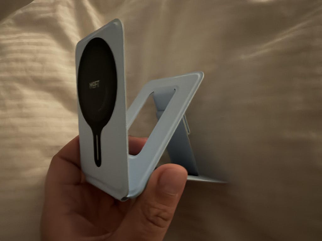 I love this Moft tripod that snaps onto the back of my phone and takes just a few seconds to flip open and set up.