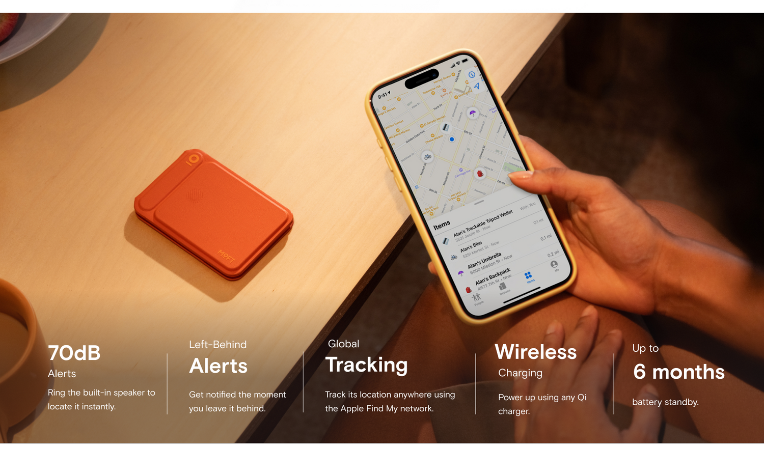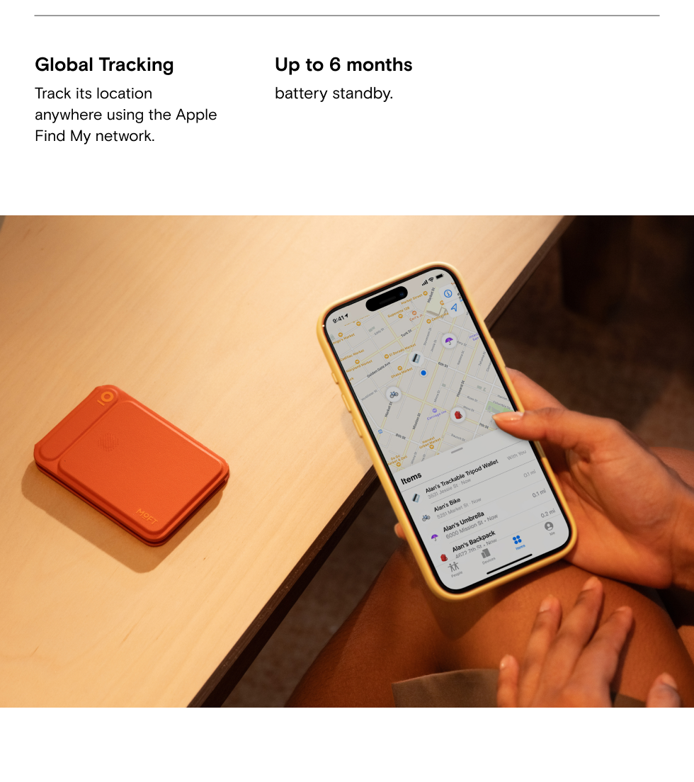 The Trackable Tripod Wallet is designed with the built-in Find My system which needs one wireless charge every 6 months to ensure Find My Service is running.