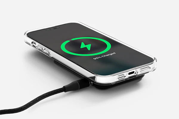 A: It only charges through MagSafe compatible cases like Apple’s MagSafe cases and our MagSafe enhanced Snap Case, so you can’t use a regular case with it.