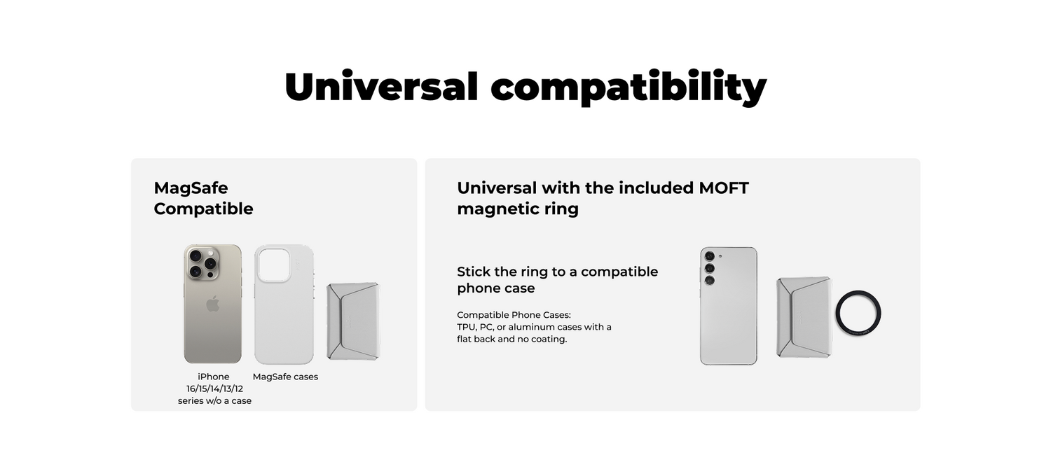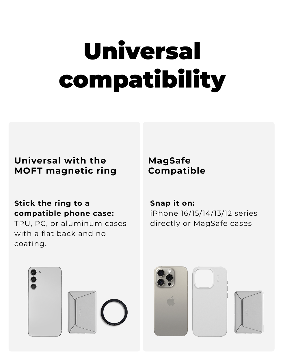 • non-MagSafe compatible phones with a phone case (a metal ring is included to be attached to the phone case)