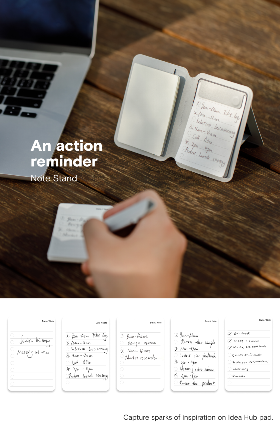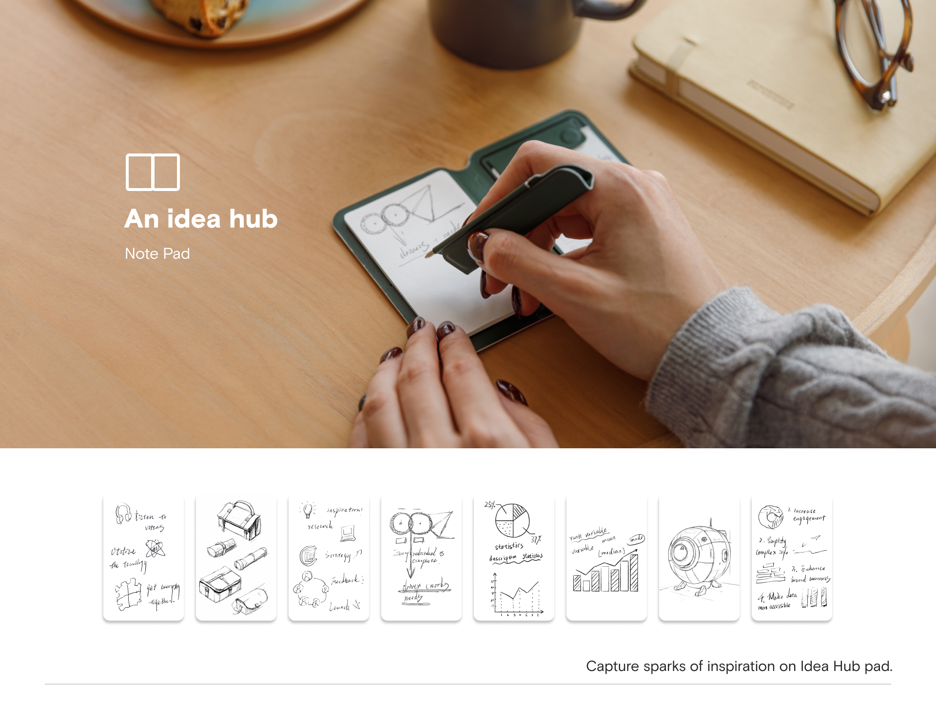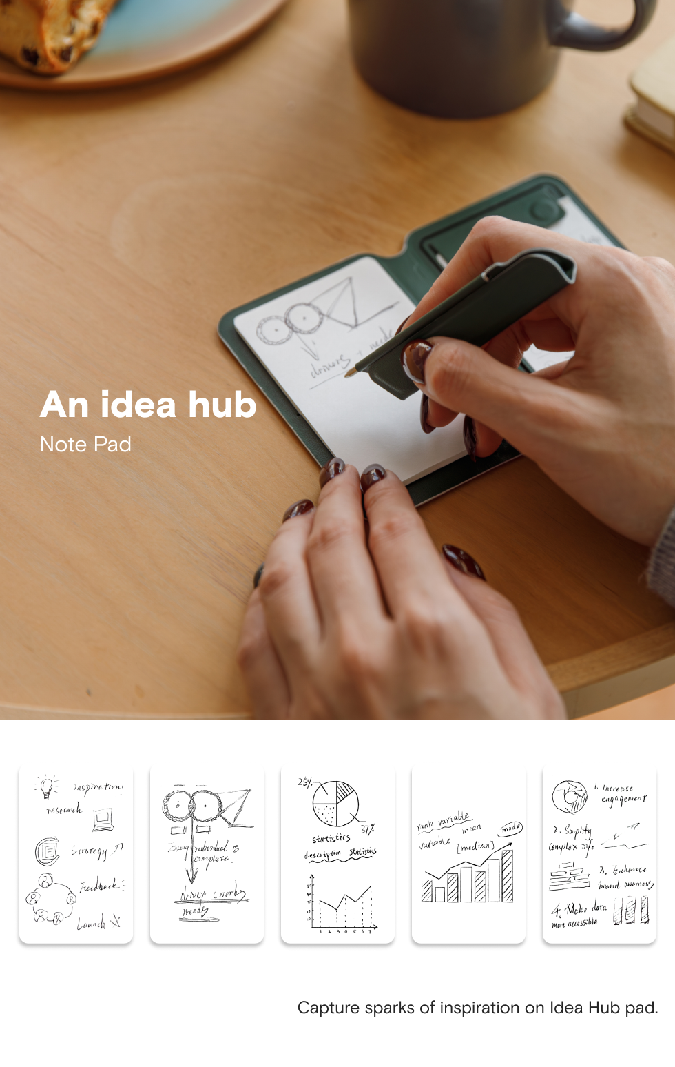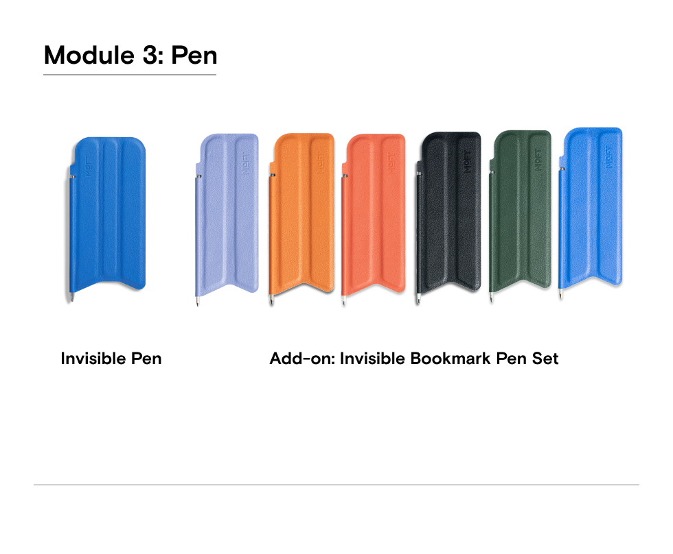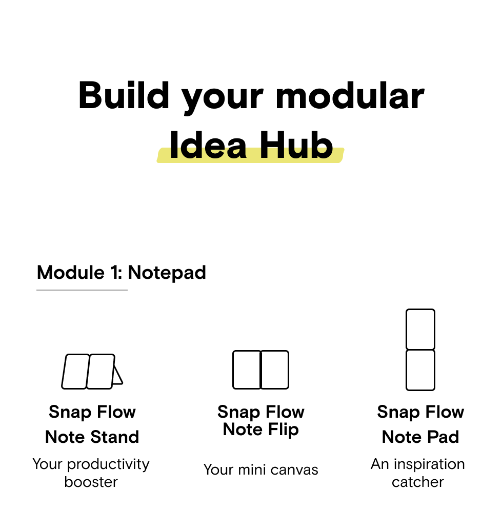 Peppermint x Blueberry, Misty Cove x Sapphire, Misty Cove, Navy Blue x Beach White, Taupe x Sunrise, Jet Black x Jet Black, Misty Cove x Midnight Green, Misty Cove x Terracotta, Note Stand, Snap Flow Note Pad, Note Flip |