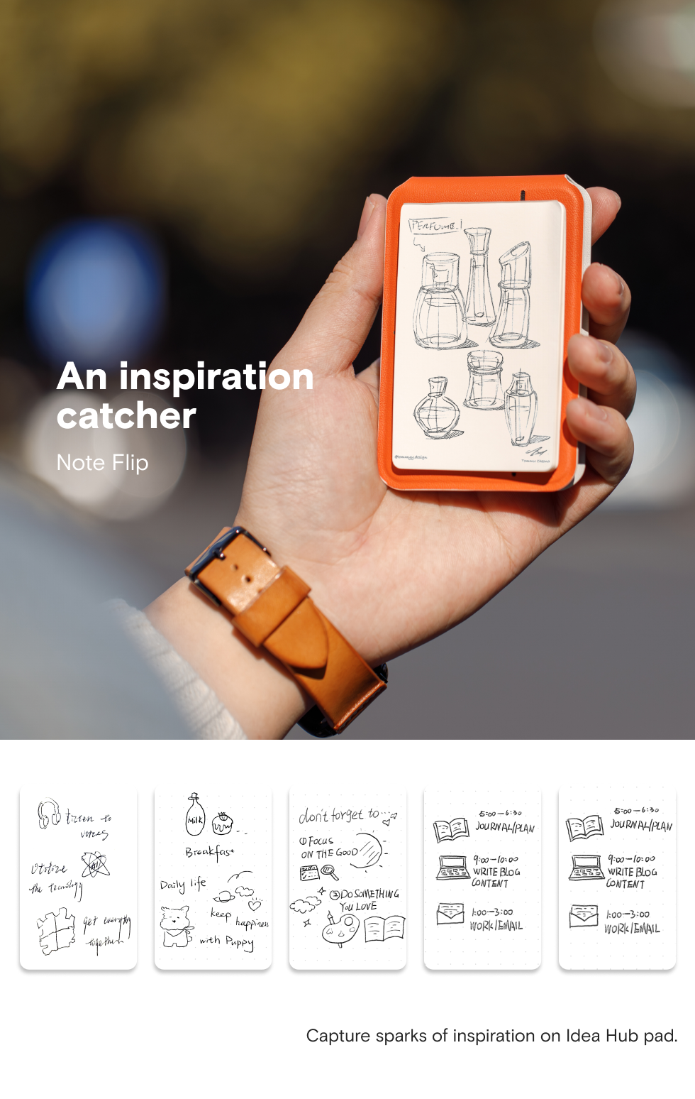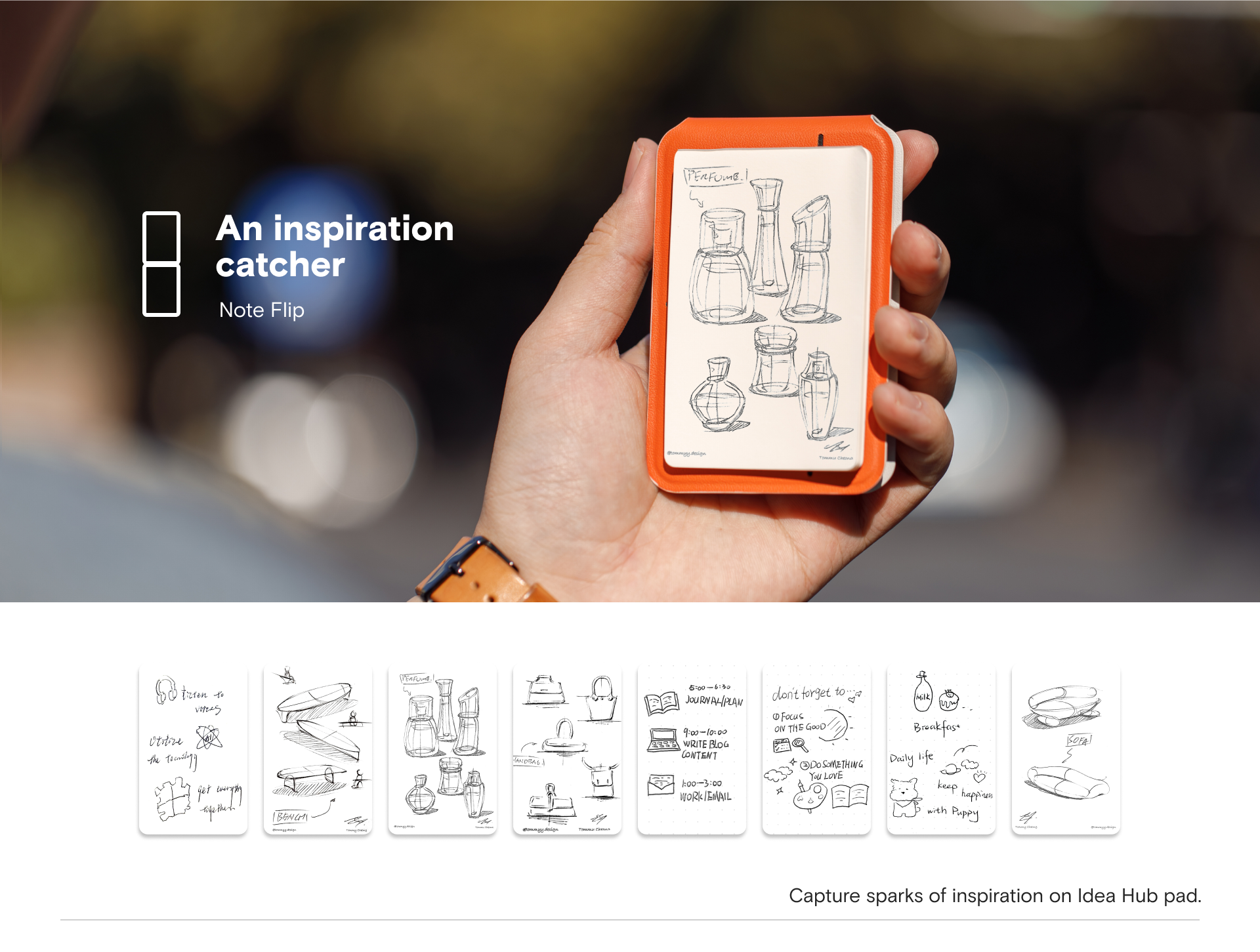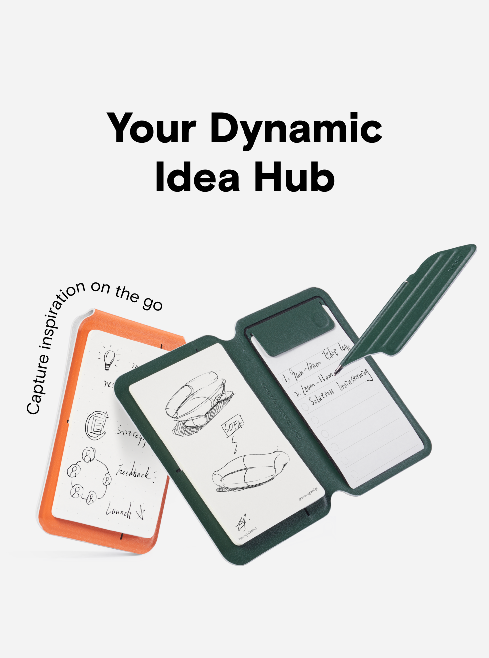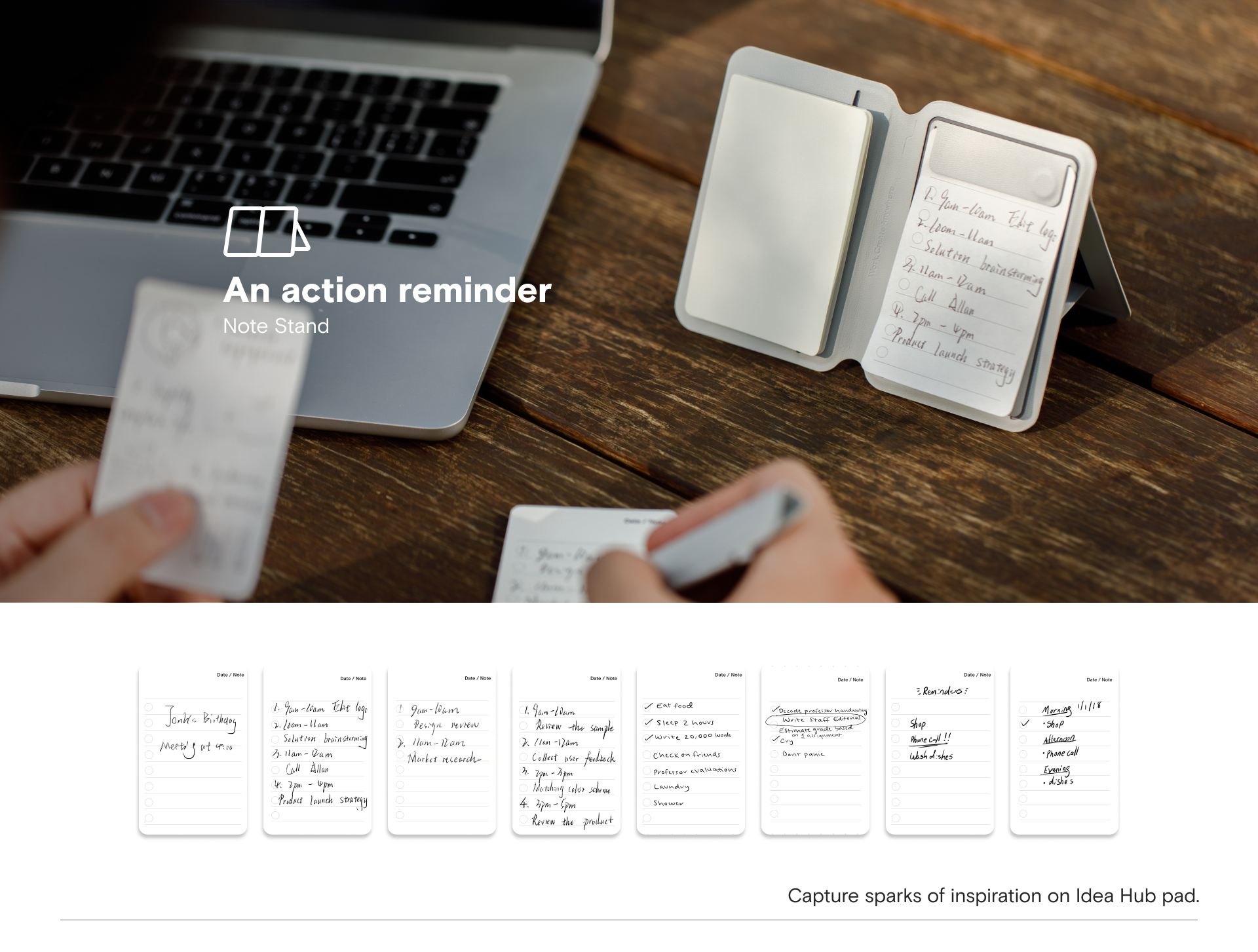 Peppermint x Blueberry, Misty Cove x Sapphire, Misty Cove, Navy Blue x Beach White, Taupe x Sunrise, Jet Black x Jet Black, Misty Cove x Midnight Green, Misty Cove x Terracotta, Note Stand, Snap Flow Note Pad, Note Flip |