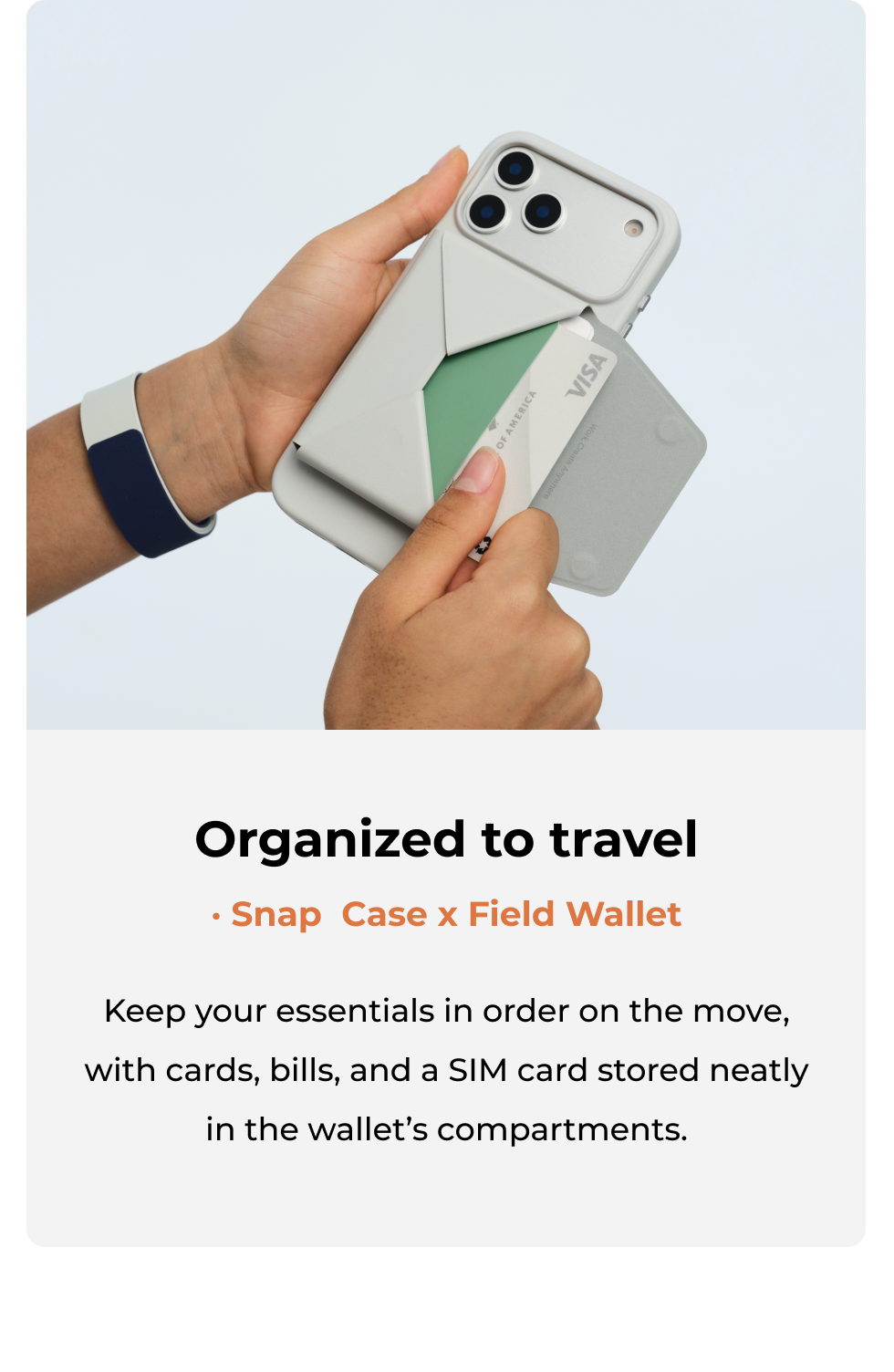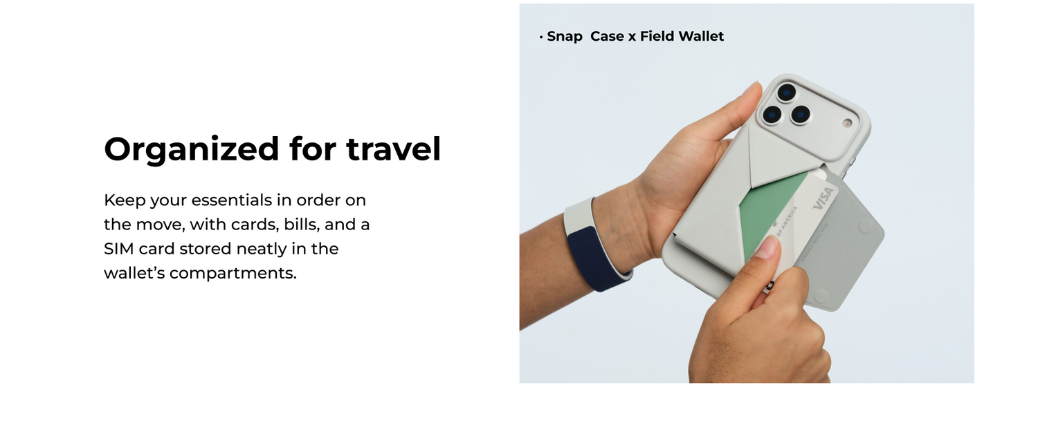 The Snap Field Wallet can hold up to 8 cards or 4~6 cards with small items such as SIM card, SIM ejector tool, and coins.