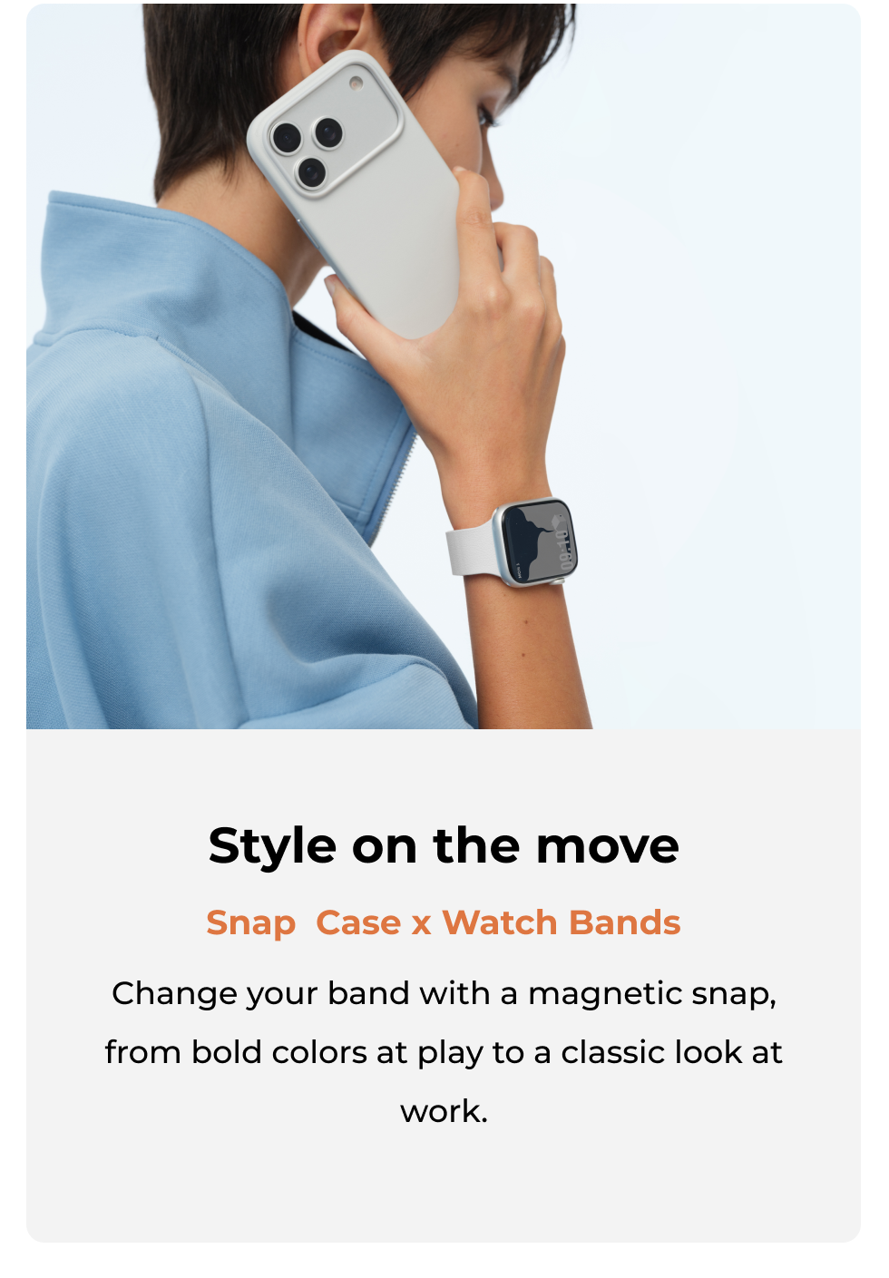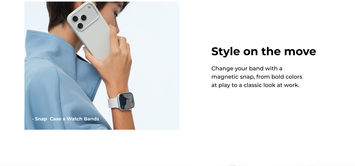 Snap Duo Watch Bands employs non-toxic, food-grade silicone, so it's suitable for long-term wear. Additionally, it's recommended taking the watch bands off to wipe the sweat in time, because it's designed with no indented grooves for a more minimalist look that fits in everyday life, from job, to social life, to fitness.