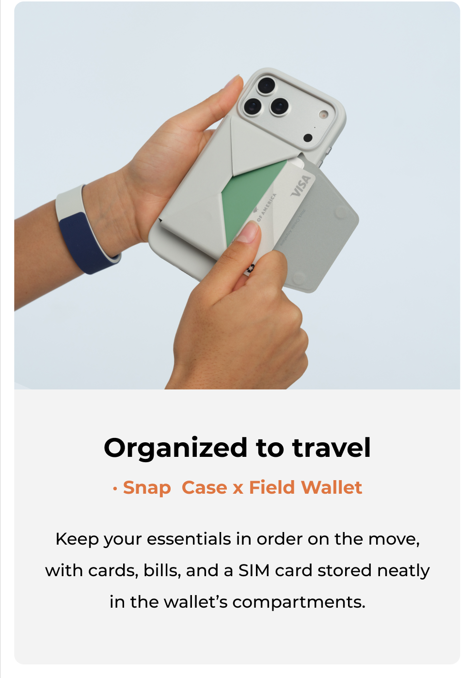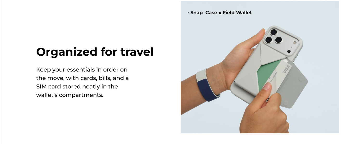 The Snap Field Wallet can hold up to 8 cards or 4~6 cards with small items such as SIM card, SIM ejector tool, and coins.